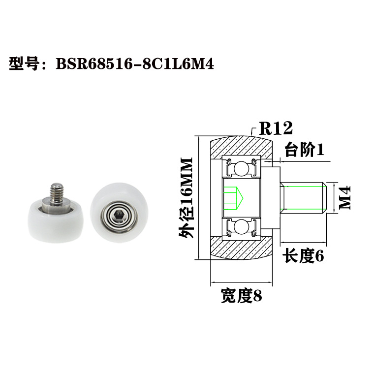BSR68516-8C1L6M4 M4x16x8mm Pom nylon plastic rubber coating external thread bearing sliding wheel bearing pulley